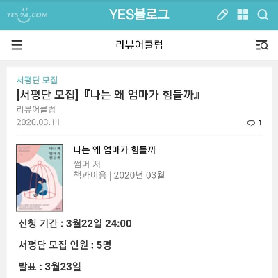 나는 왜 엄마가 힘들까썸머 저책과이음 |2020년 03월신청기간: 3월22일24:00 서평단 모집인원: 5명 발표: 3월23일 신청방법:댓글로신청해주세요! * 페이스북을 사용하신다면 포스트를 페이스북에 공유하신 뒤 댓글로 알려주세요!! ...
