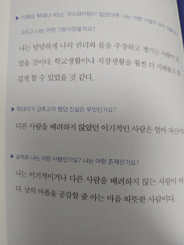 속상하고 아픈 마음은 이렇게 상황을 객관화하며 나의 잘못이 없었고, 학대의 하나였음을 바라보면서 치유하구요.