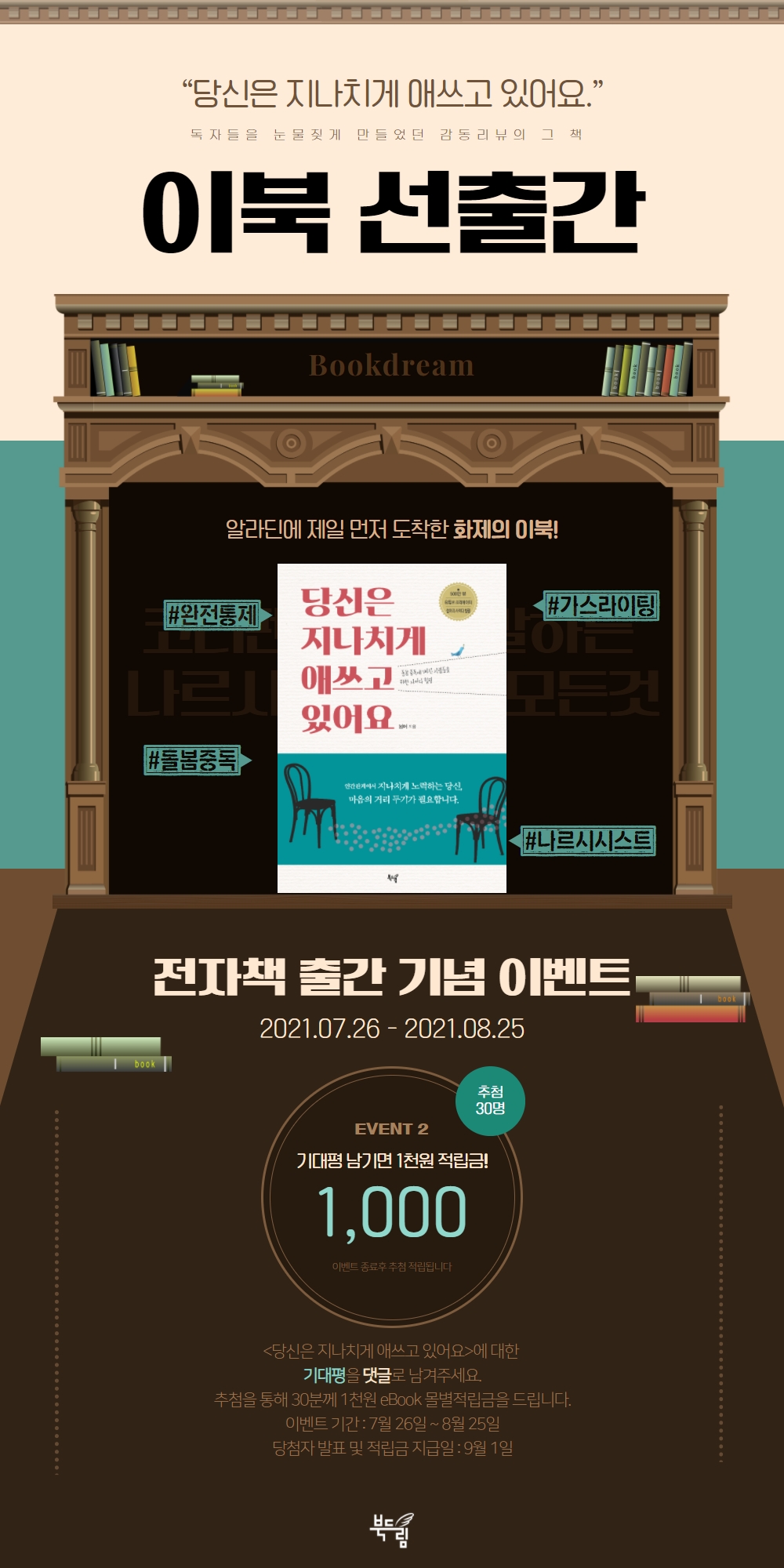 | 서평이벤트 (전자책) // 당신은 지나치게 애쓰고 있어요 (~9월 26일) (0) | 2021.09.16 |