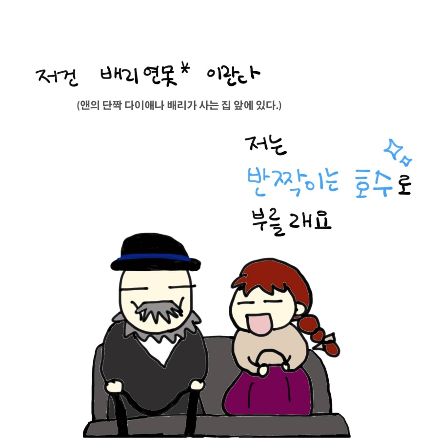눈 앞에 반짝이는 호수를 마주하니 이렇게 예쁜 곳을 '배리 연못'이라고 부르다니! '반짝이는 호수'가 맞구만! 이라는 생각이 절로 들었다. 배리 연못이라는 이름은 그저 다이애나 배리의 아버지 배리씨의 집이 호수 윗편에 위치해서 에이본리 마을 사람들이 그렇게 불렀던 것이다.