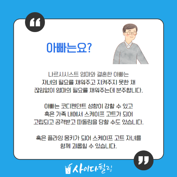 7월 말이나 8월부터 자료가 정리되는대로 나르시시스트 아빠에 대한 영상을 올릴 예정입니다.